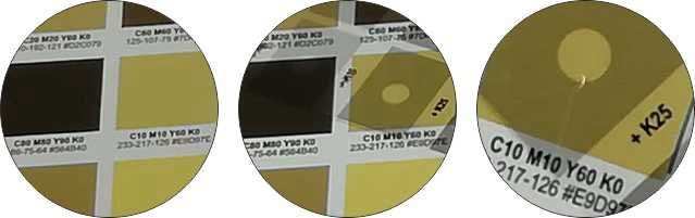 The basic color C10M10Y60K0 (the left picture) is darkened via 25% raster (K25) from the ruler (the middle picture) to the new color C10M10Y60K25 (the right picture). You can see the comparison of the original and the darkened color in the central hole.