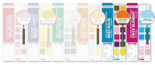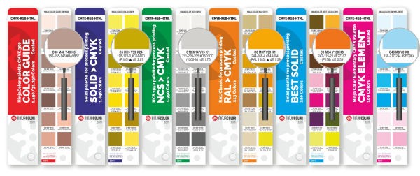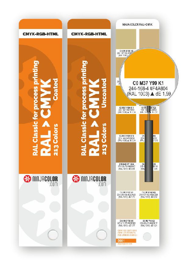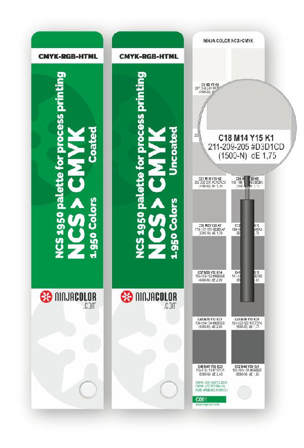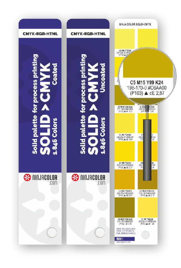 The NINJA COLOR® system includes basic, specialized and conversion color guides. All colors in these color guides include printing definitions (CMYK), electronic publishing values (RGB), Internet hexadecimal values (html), alternatively numbers of default direct colors and color difference dE2000.