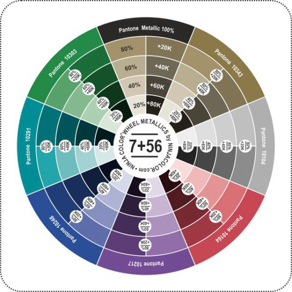 Are you considering using metallic colors in the graphic design of exclusive printed materials or packaging? If so, you need to have the right color swatches to hand. Simulating these colors on a monitor (RGB) or in four-color printing (CMYK) is not possible. Instead of the expensive Pantone® Metallics Color Swatch, the Ninja Color® Wheel Metallics Swatch is often sufficient. This contains the most commonly used Pantone® metallic colors - gold, silver, blue, red, purple, green and petrol. You have 8 more shades of each of these (4 lighter and 4 darker). Not even the much more expensive Pantone® Metallics Colors swatches can offer you that!