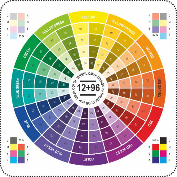 Safety in colour is brought to you by the Ninja Color Wheel CMYK Basic swatch. Introduces single component colours (C, M, Y, K) and their combinations (R, G, B)  The swatch contains 63 shades of basic CMYK and RGB colours: